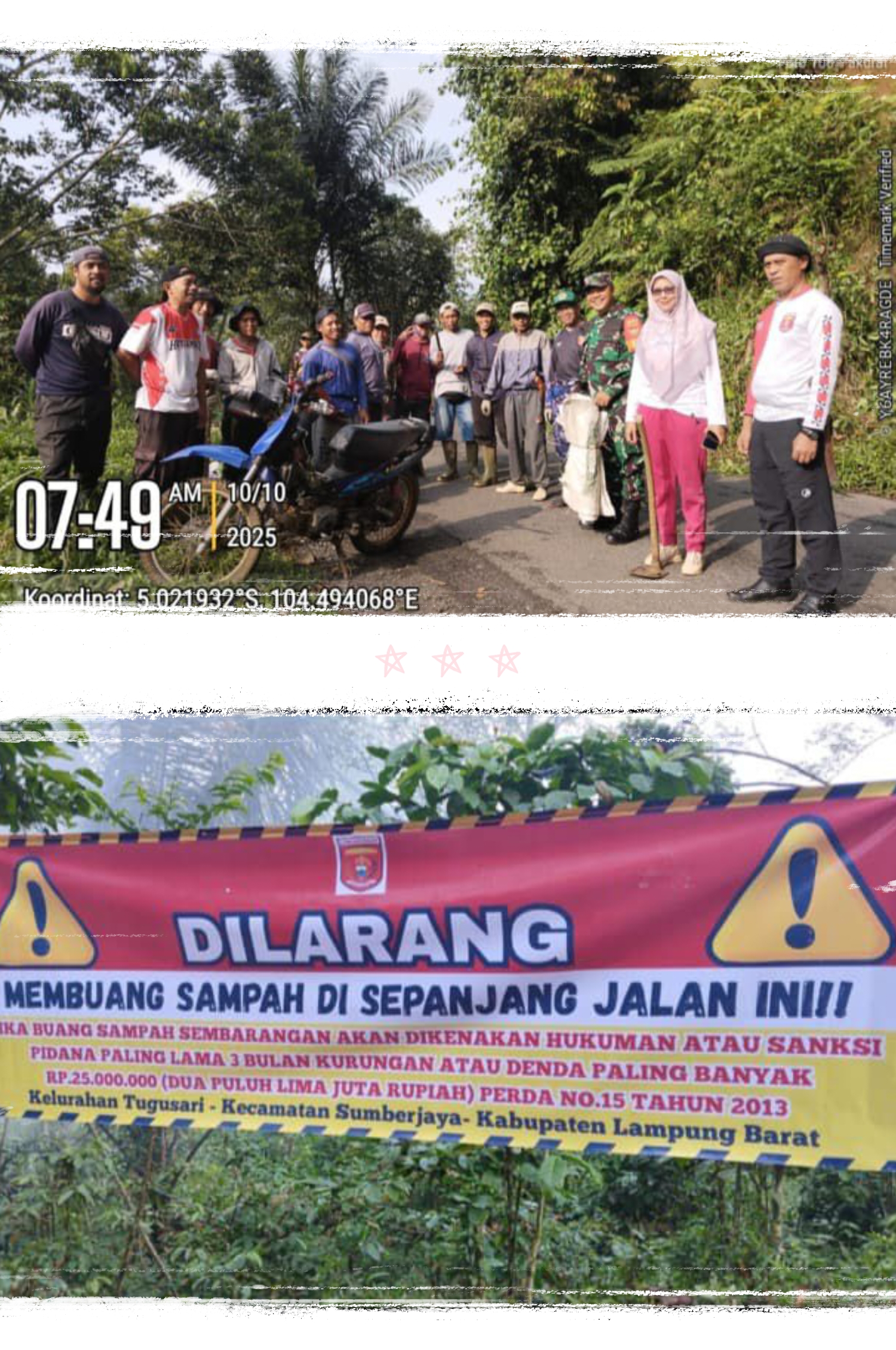 Mitranegaramntv.com Lampung Barat Kelurahan Tugu Sari bersama anggota Koramil 422-06 dan Polsek Sumber Jaya sekaligus masyarakat setempat mengadakan kegiatan Jum’at Bersih dengan semangat gotong royong. Kegiatan ini dilaksanakan di jalan penghubung antara Kecamatan Sumber Jaya dan area kebun tebu, tepatnya di wilayah Kelurahan Tugu Sari, Kecamatan Sumber Jaya.Jumat,10/10/2025.