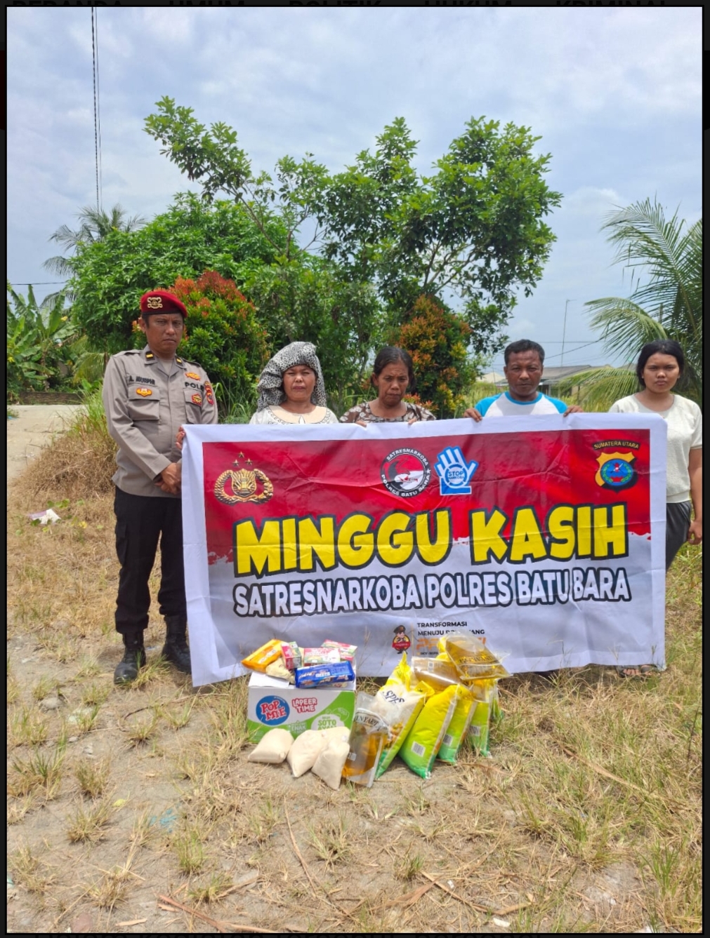 Sumut-mitranegaramntv.com Dalam rangka mempererat hubungan silaturahmi dengan masyarakat sekaligus menunjukkan kepedulian sosial, Satresnarkoba Polres Batu Bara kembali melaksanakan kegiatan Minggu Kasih dengan menyalurkan bantuan sembako serta memberikan imbauan tentang bahaya penyalahgunaan narkoba kepada warga.
