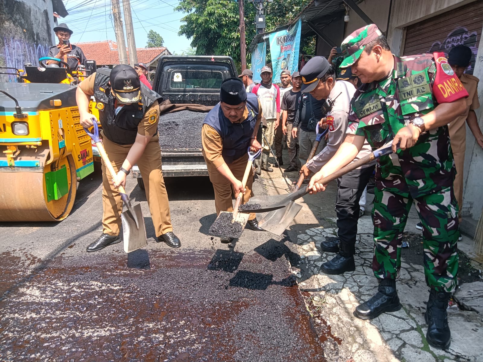 Ditempat yang sama saat pengerjaan jalan juga turut dihadiri oleh AKP Abdulah Safii Kapolsek Bojonggede dan Mayor Armed juga Ruwijo Danramil 04 kecamatan bojonggede Kabupaten bogor Jawa barat yang ikut turun lansung dilapangan terlihat dengan jelas oleh warga waktu pelaksanaan pekerjaan rehab jalan Hot mik atas kehadiran mereka menjadi sebuah monifasi tersendiri yang patut di jadikan contoh untuk desa lainnya”, tutupnya