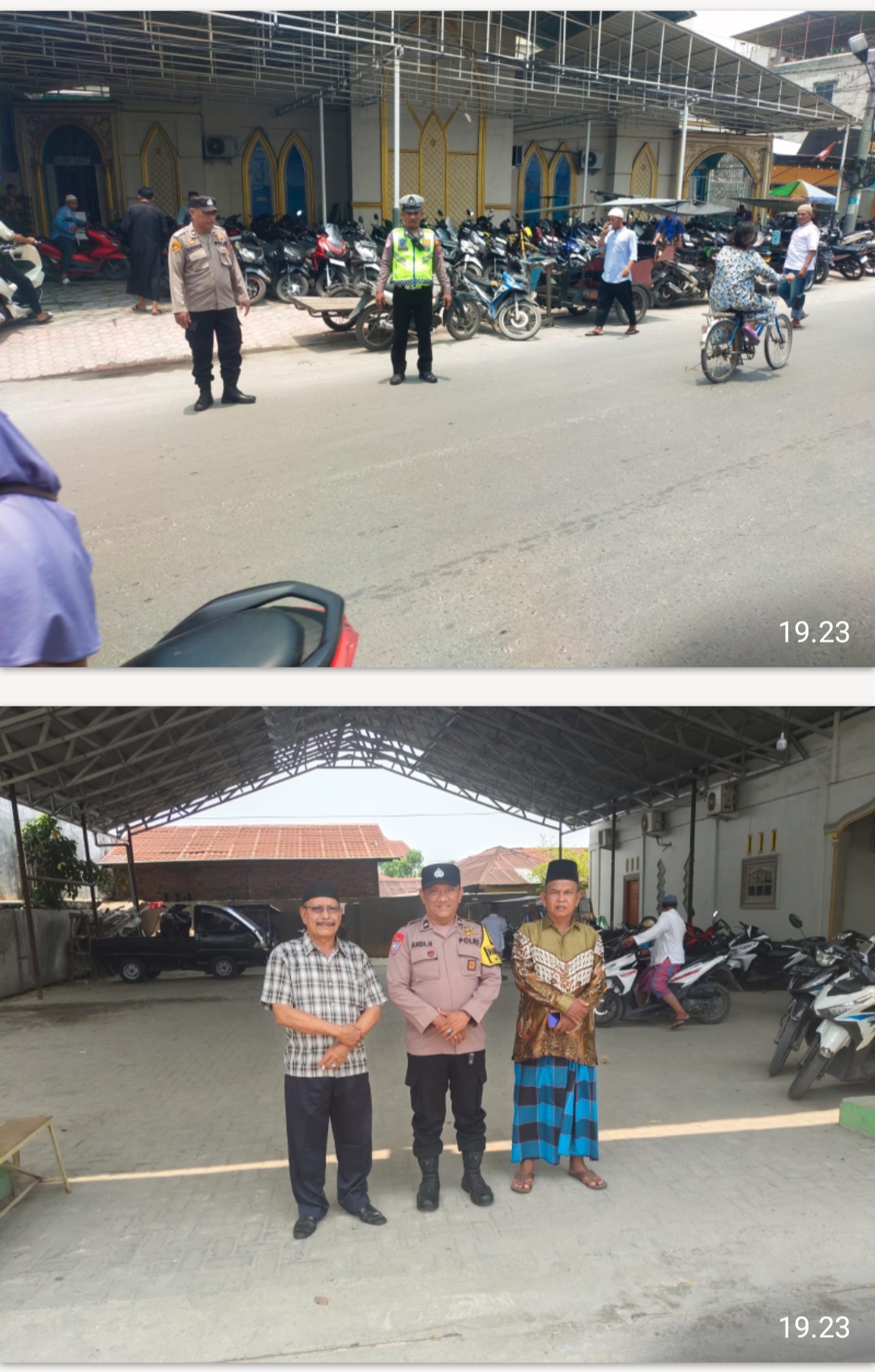 Dalam pengamanan ini, petugas tampak berjaga di gerbang masuk dan area parkir guna mengatur lalu lintas serta memantau situasi keamanan lingkungan masjid.