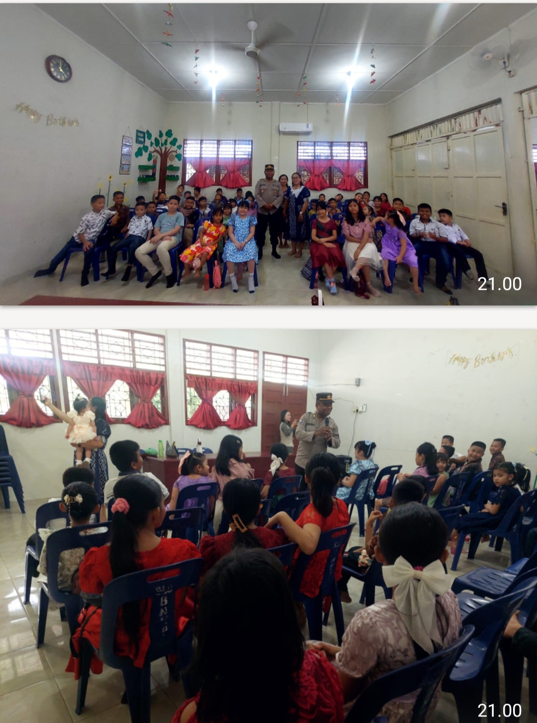 Dalam suasana yang akrab dan penuh keceriaan, AKP Zainuddin bersama personel lainnya memberikan bimbingan dan penyuluhan (Binluh) kepada anak yang hadir di aula sekolah minggu tersebut.