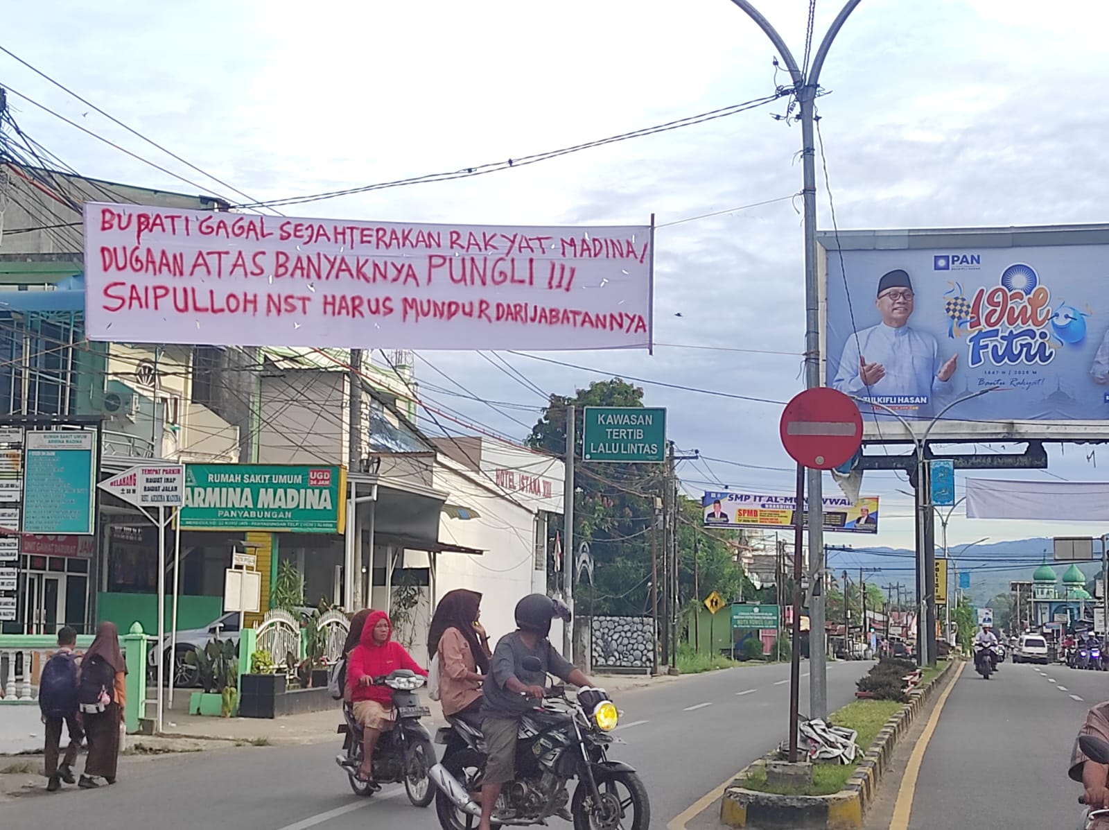“Bupati gagal sejahterakan masyarakat Madina, dugaan banyaknya pungli, Saipullah Nasution harus mundur dari jabatannya,” demikian bunyi tulisan dalam spanduk tersebut.