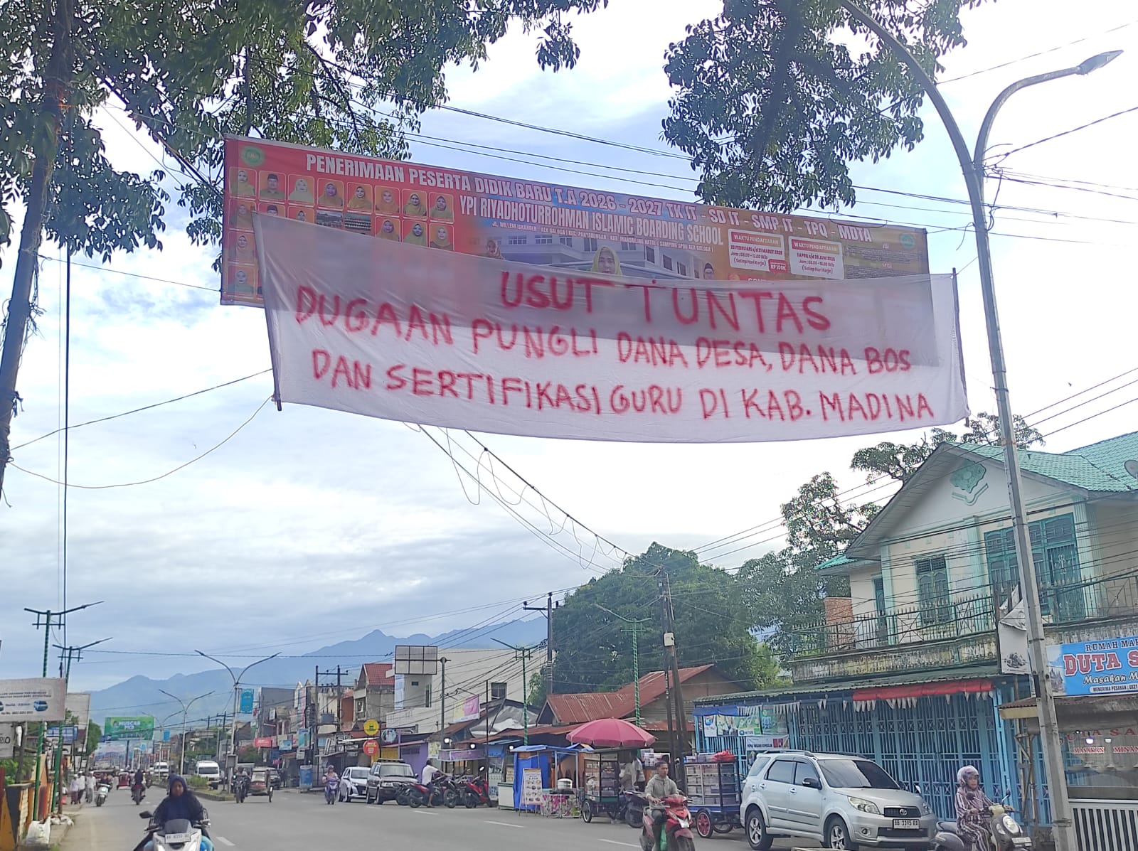 Sepasang spanduk tak bertuan berisi desakan agar Bupati Mandailing Natal, Saipullah Nasution, mundur dari jabatannya dan tuntutan pengusutan dugaan pungutan liar (pungli) muncul di sepanjang Jalan Lintas Sumatera, tepatnya di depan kantor KPU dan dekat Pasar Baru, Sabtu pagi 11/04/2026.