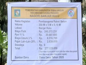 Proyek rabat beton yang bersumber dari Dana Desa Kabupaten Simalungun Tahun Anggaran 2025 ini memiliki volume 200 meter x 5 meter x 0,15 M meter dengan total anggaran mencapai Rp 277.225 .650 Proyek ini disambut antusias oleh masyarakat karena sangat dibutuhkan untuk menunjang akses dan aktivitas warga sehari-hari Kepedulian Pj Pangulu Heri Kusmawan SPd.MM yang mewakili Camat